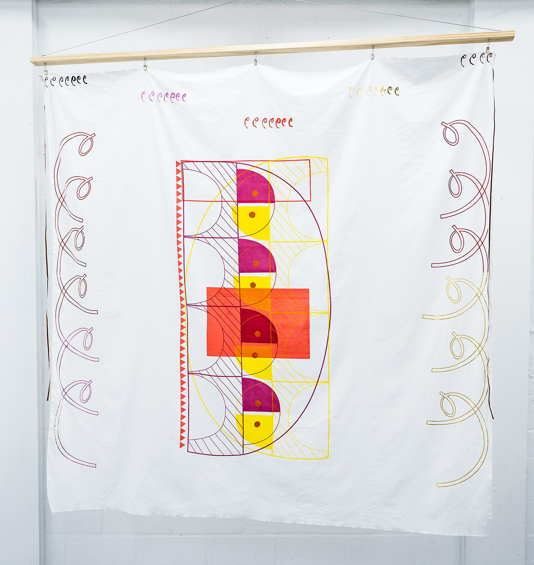 This work consists of medium- and large-scale hand-printed textiles inspired by Wiener Werkstätte's use of monograms as personal logos and the distinctiveness of handwriting and handwritten signatures. These prints navigate the space between abstraction and figuration, encouraging viewers to reflect on the prevalence and significance of personal branding in a world where social media increasingly expects us to promote and brand ourselves.